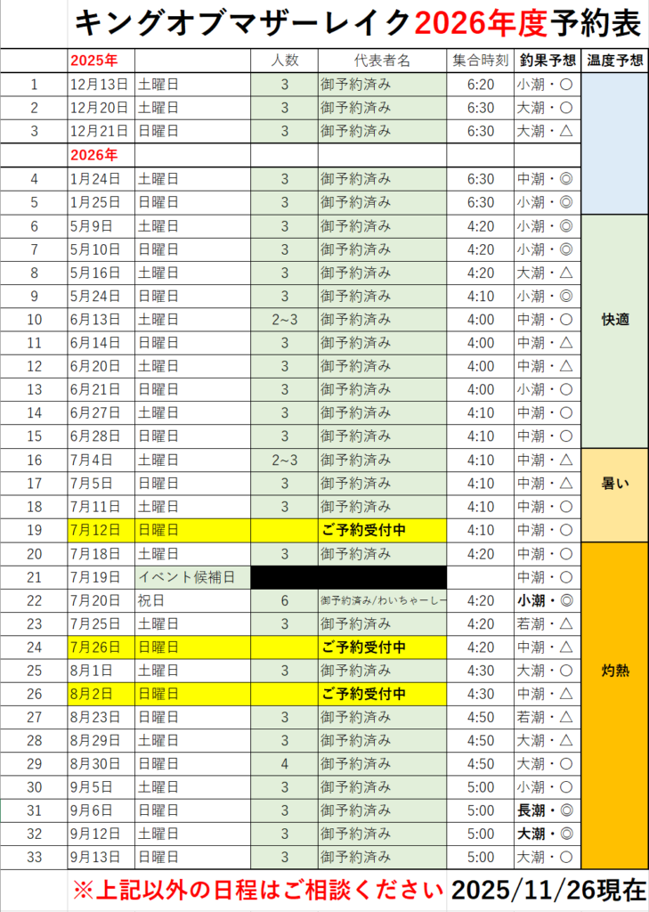 2026年度の御予約について (2025年12月~2026年9月末まで)2025/11/26現在